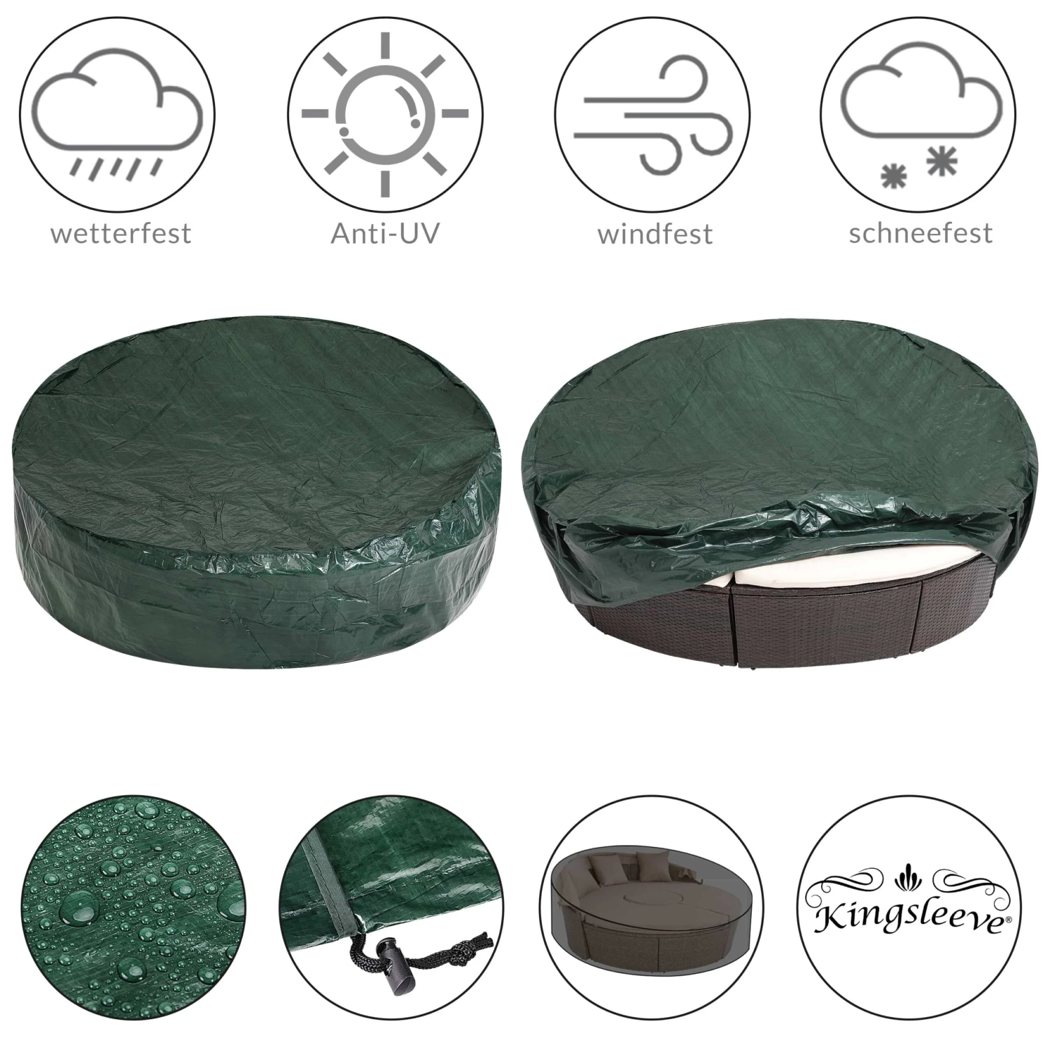 Dank der verstärkter Doppelnaht ist die Abdeckung auch an den Nähten und Kanten strapazierfähig und robust. Mit der umlaufenden Kordel fixieren Sie die Schutzhülle windfest über ein Zugband.