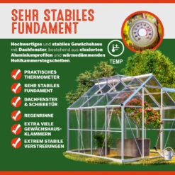 Hochwertiges und stabiles Gewächshaus mit 2 Dachfenstern, bestehend aus eloxierten Aluminiumprofilen und wärmedämmenden Hohlkammerstegscheiben. Die klappbaren, praktischen Dachfenster sorgen für die richtige Luftzirkulation. Die Regenrinne lenkt das Regenwasser seitlich am Gewächshaus nach unten. So können Sie es mit entsprechenden Behältnissen direkt abfangen und nutzen.