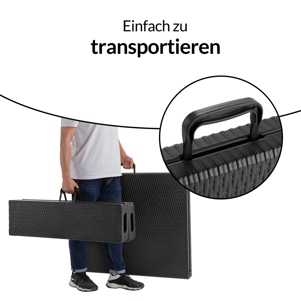 Die Garnitur ist schnell und einfach aufgebaut und lädt zum gemütlichen Zusammensitzen ein. Sie lässt sich platzsparend zusammenklappen und mit den integrierten Griffen bequem transportieren. Durch das geringe Klappmaß, passt sie bequem in fast jeden Kofferraum oder kann bis zum nächsten Event platzsparend eingelagert werden.