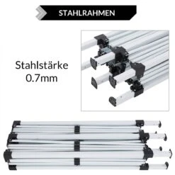 Die Stahlrohre haben einen StĂ€rke von 0,7 mm. Metallverstrebungen und verankerbare FĂŒĂe geben dem Pavillon einen sehr stabilen Stand.