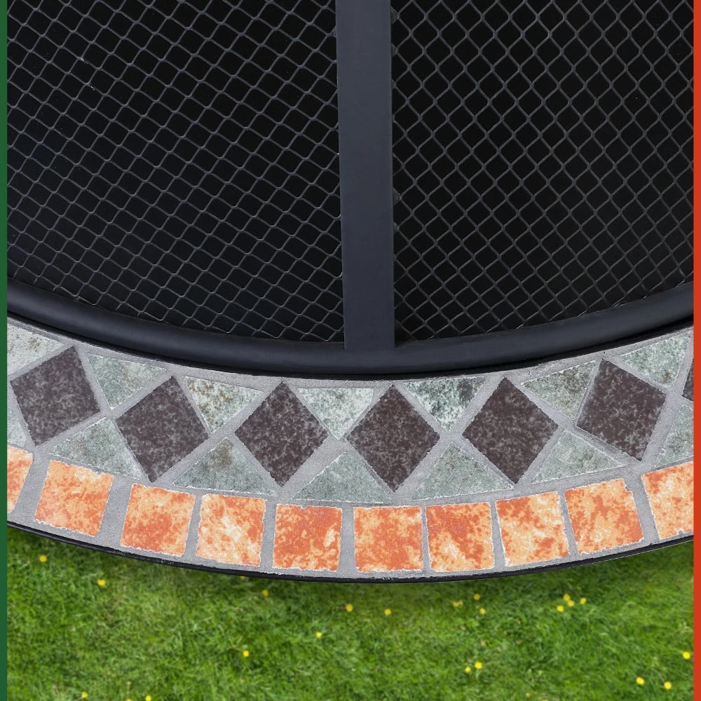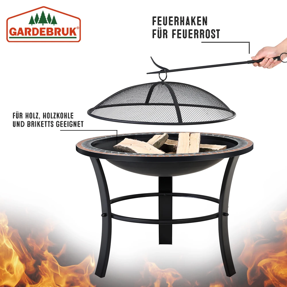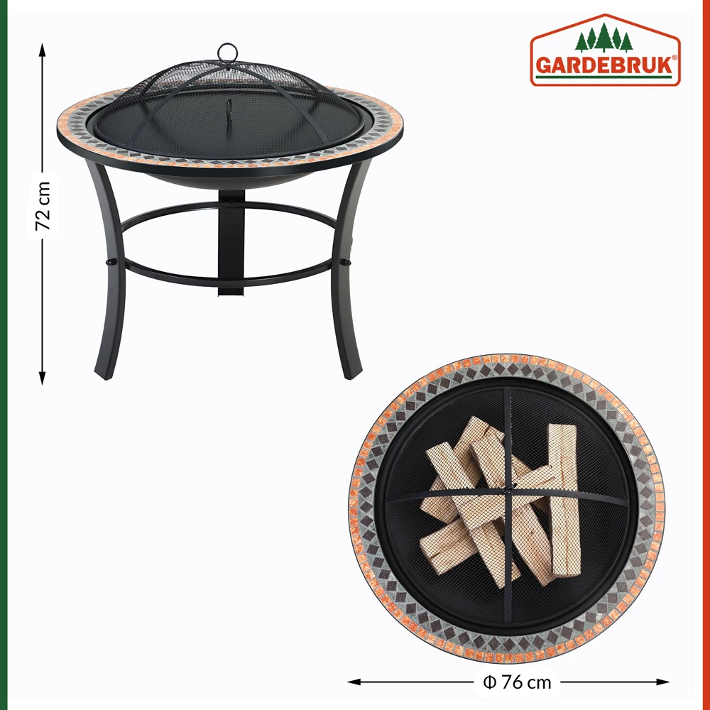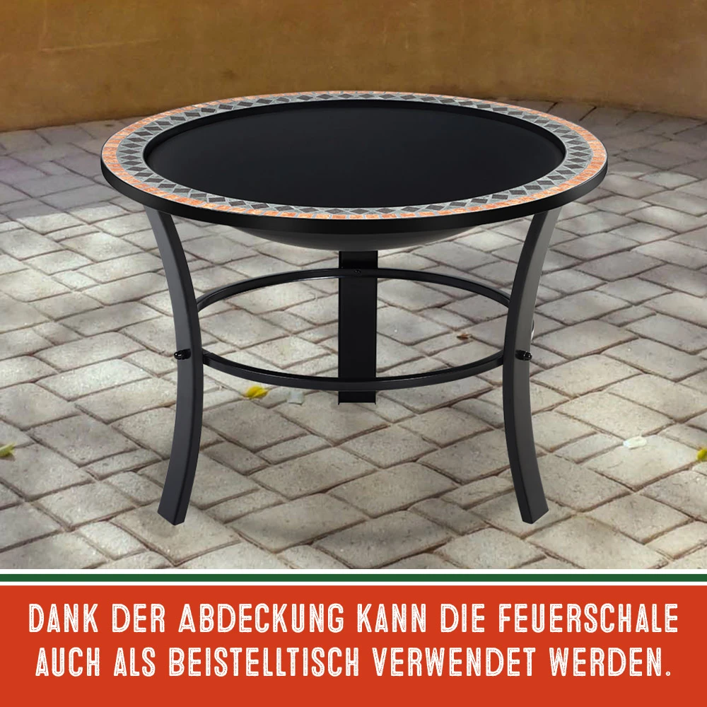 Exklusive Mosaik Feuerschale mit Gestell aus pulverbeschichtetem Stahl und à 76 cm. Echte Mosaiksteine schmĂŒcken die Feuerschale und sorgen so fĂŒr ein extravagantes Ambiente in Ihrem Garten oder auf Ihrer Terrasse. Dank der praktischen Abdeckung kann die Feuerschale auch als Beistelltisch verwendet werden.