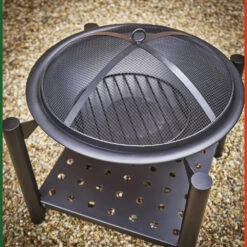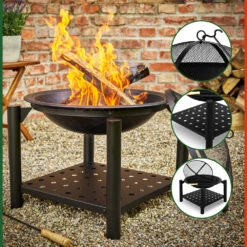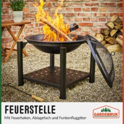 Mit dem mitgelieferten Funkengitter können Sie in Ruhe das Feuer genießen. Besonders praktisch ist zudem der mitgelieferte Feuerhaken und das Ablagefach. Sowohl die Feuerschale als auch das Untergestell sind aus massivem und robustem, pulverbeschichtetem Stahl.