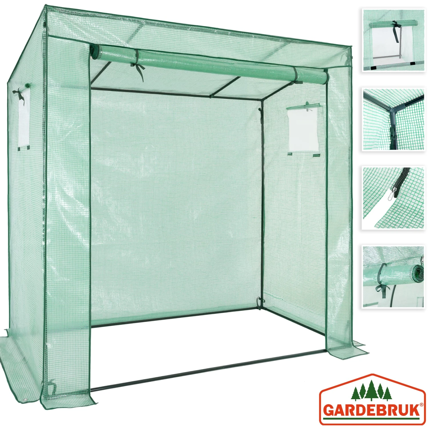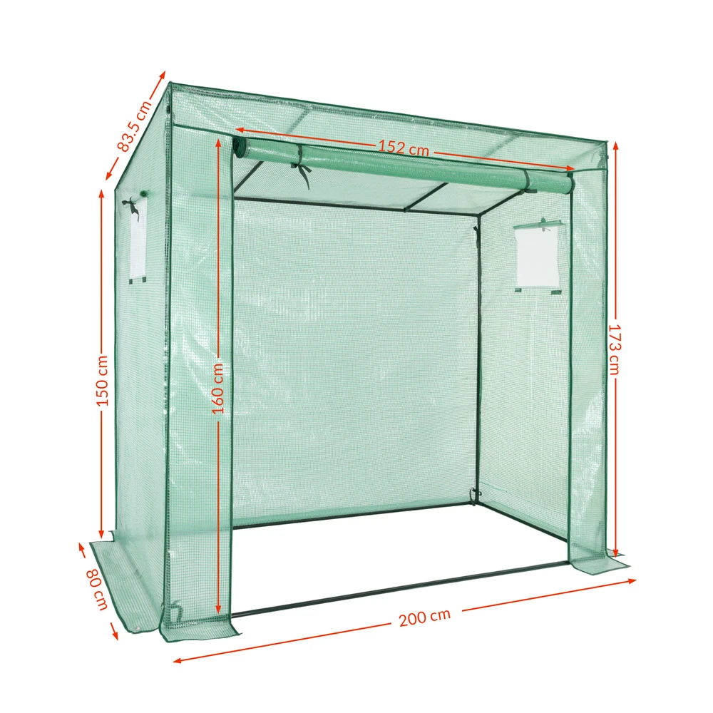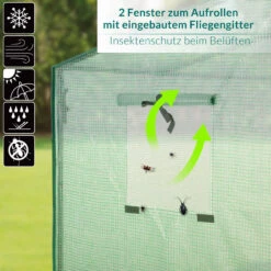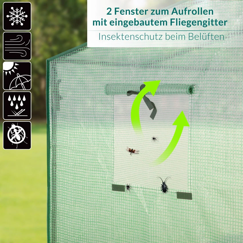 Die Folie lässt immer genügend Sonnenlicht durch und speichert außerdem Feuchtigkeit und Wärme. Sollte es zu heiß werden, öffnen Sie einfach den Reißverschluss der Tür und Fenster und rollen diese auf. So wird eine ideale Luftzirkulation gewährleistet. Die Fenster haben zusätzlich Fliegengitter um Insekten fernzuhalten.