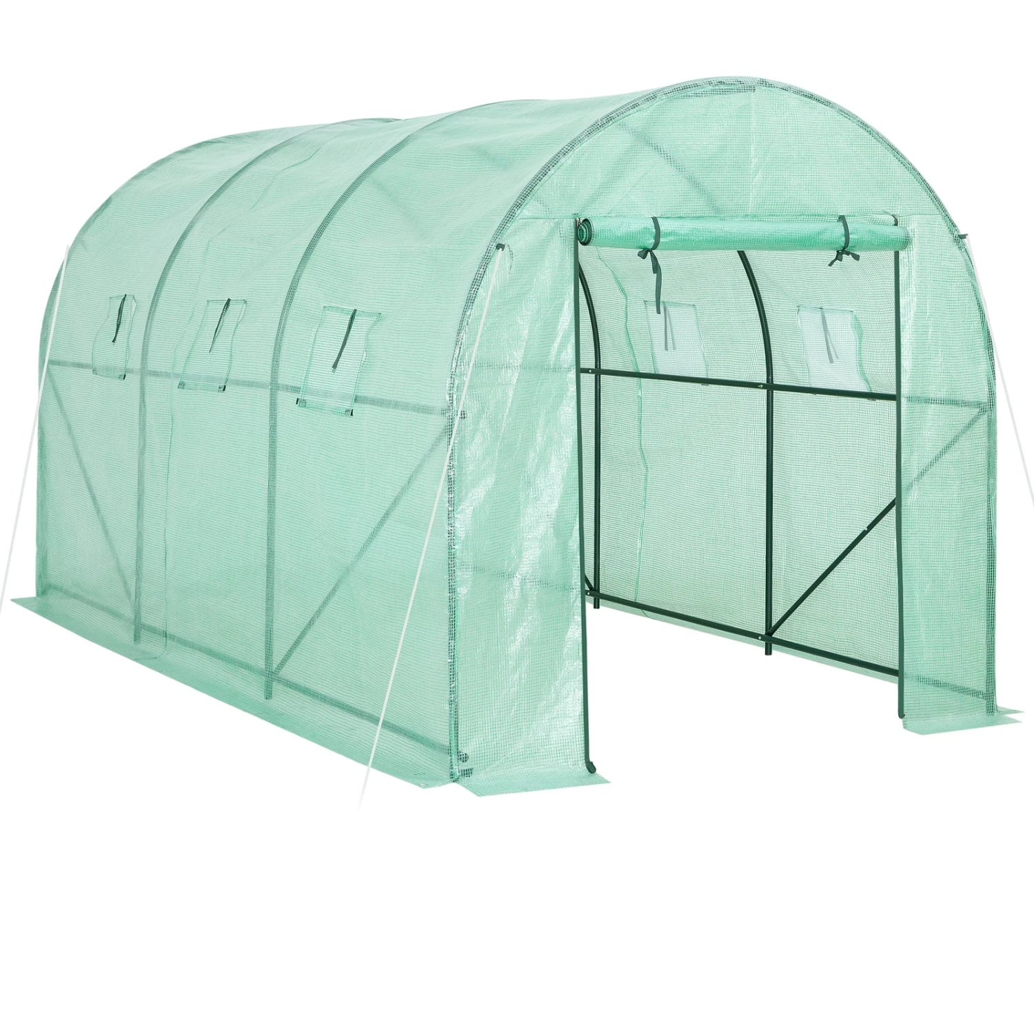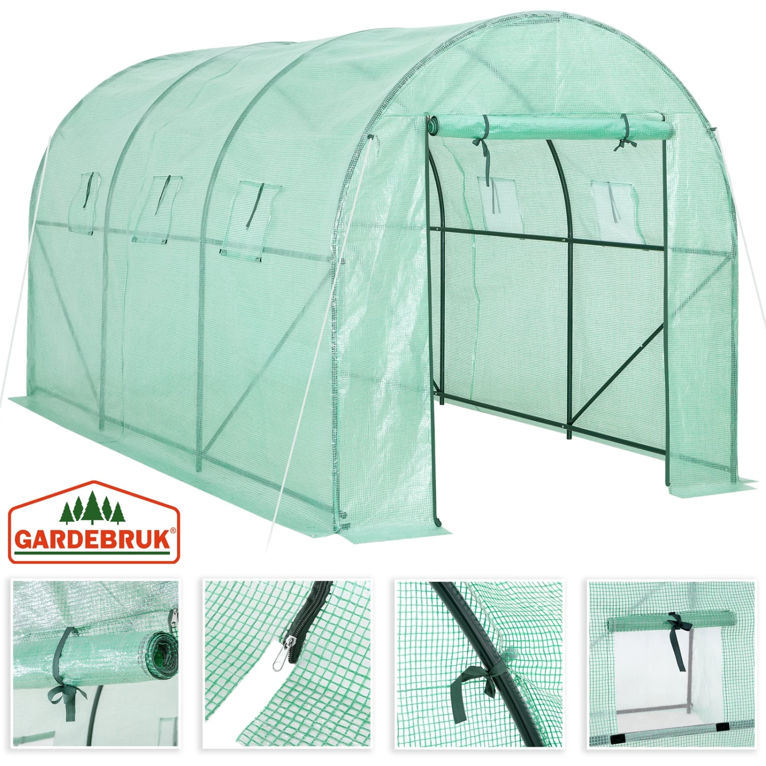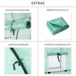 Die Folie lässt immer genügend Sonnenlicht durch und speichert außerdem Feuchtigkeit und Wärme. Sollte es zu heiß werden, öffnen Sie einfach den Reißverschluss der Tür und Fenster und rollen diese auf. So wird eine ideale Luftzirkulation gewährleistet. Die Fenster haben zusätzlich Fliegengitter um Insekten fernzuhalten.