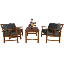 Die Lounge Sitzgruppe Atlas aus FSC®-zertifiziertem Akazienholz besteht aus einem Tisch, zwei Stühlen und einer Sitzbank. Ausgestattet ist die Gartengarnitur mit anthrazitfarbenen, 20cm dicken Rückenkissen und 9,5cm dicken Sitzauflagen (gekettelt).