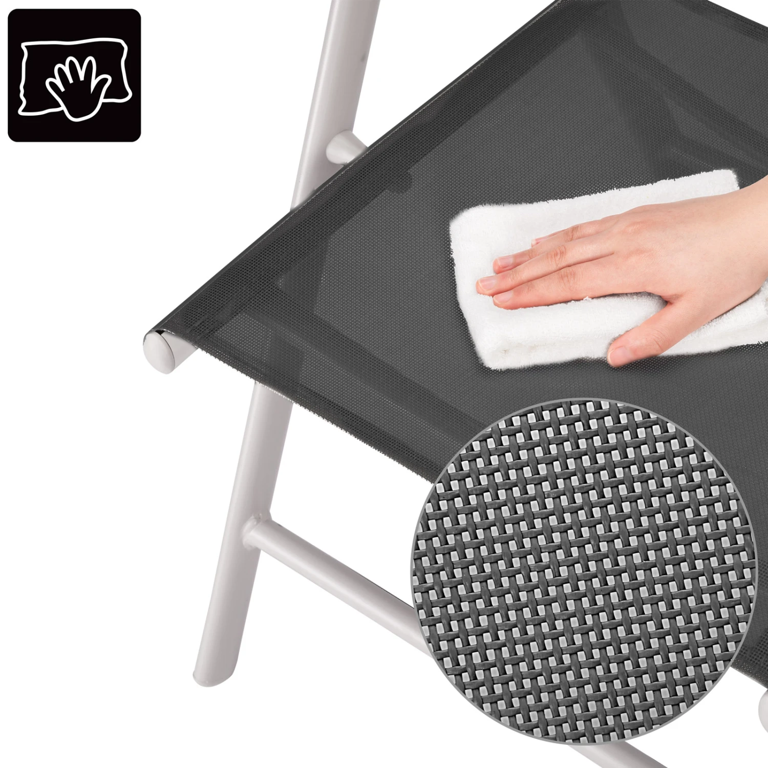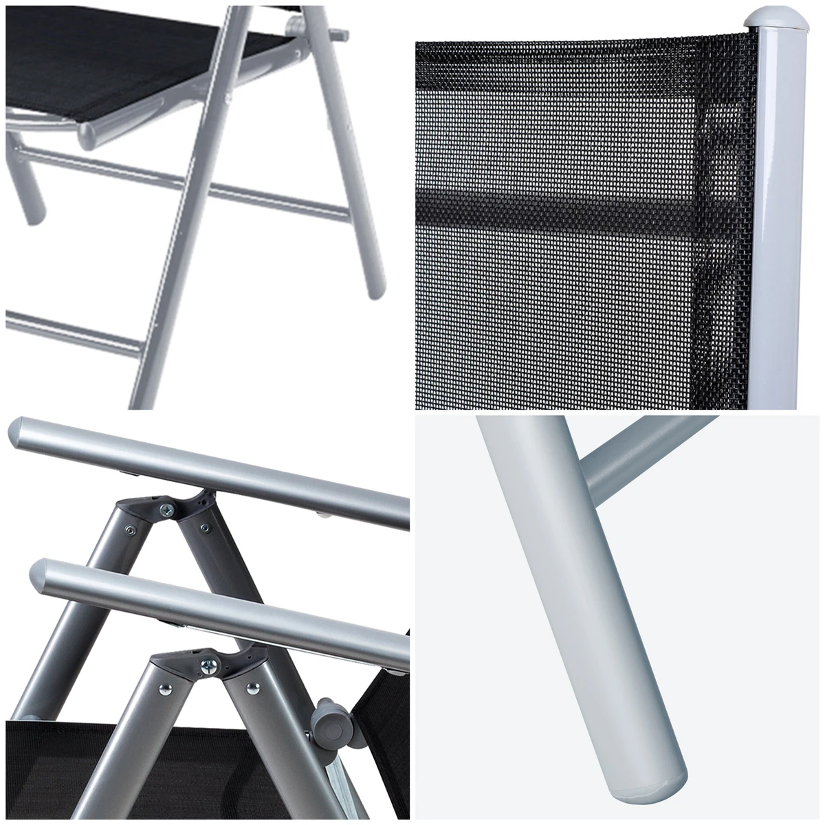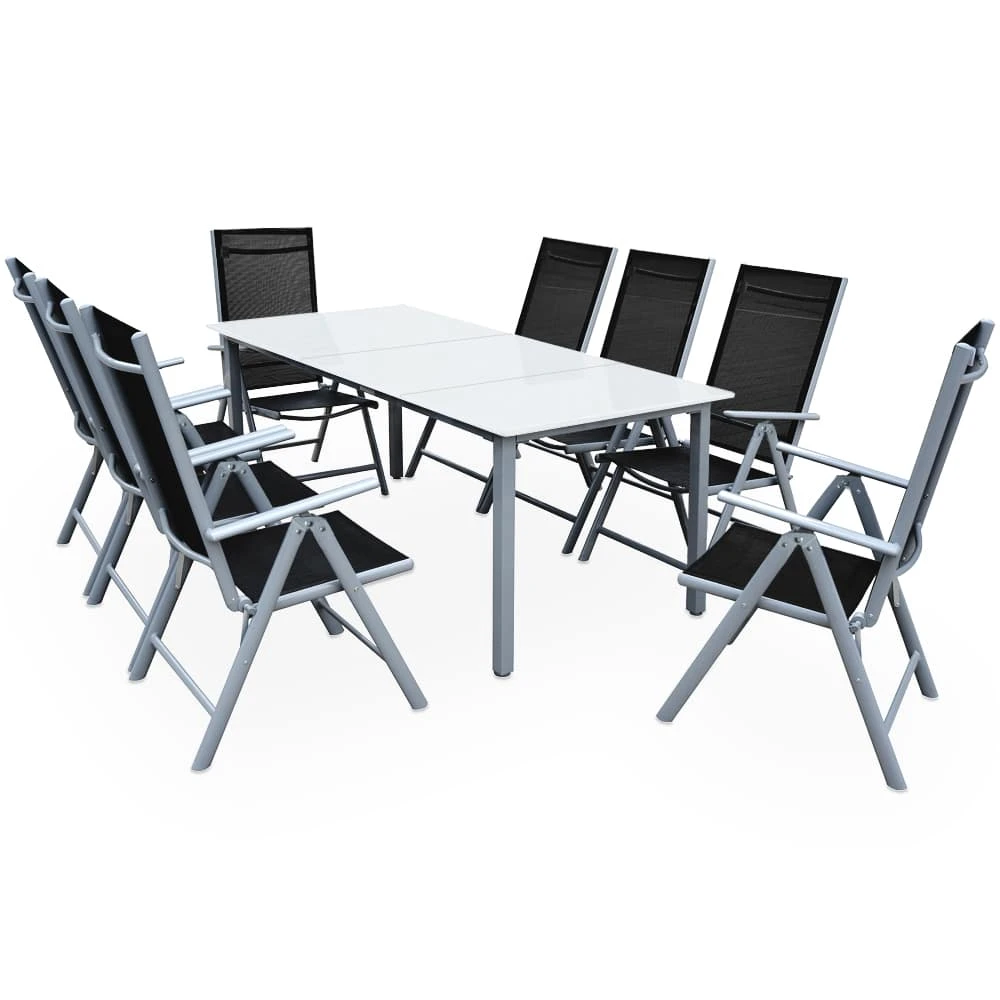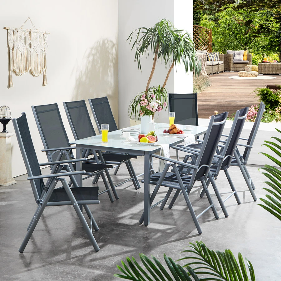 Diese elegante Aluminium-Sitzgruppe besteht aus 1 Tisch (190 cm) und 8 klappbaren Hochlehnern mit verstellbaren RĂŒckenlehnen.
