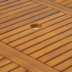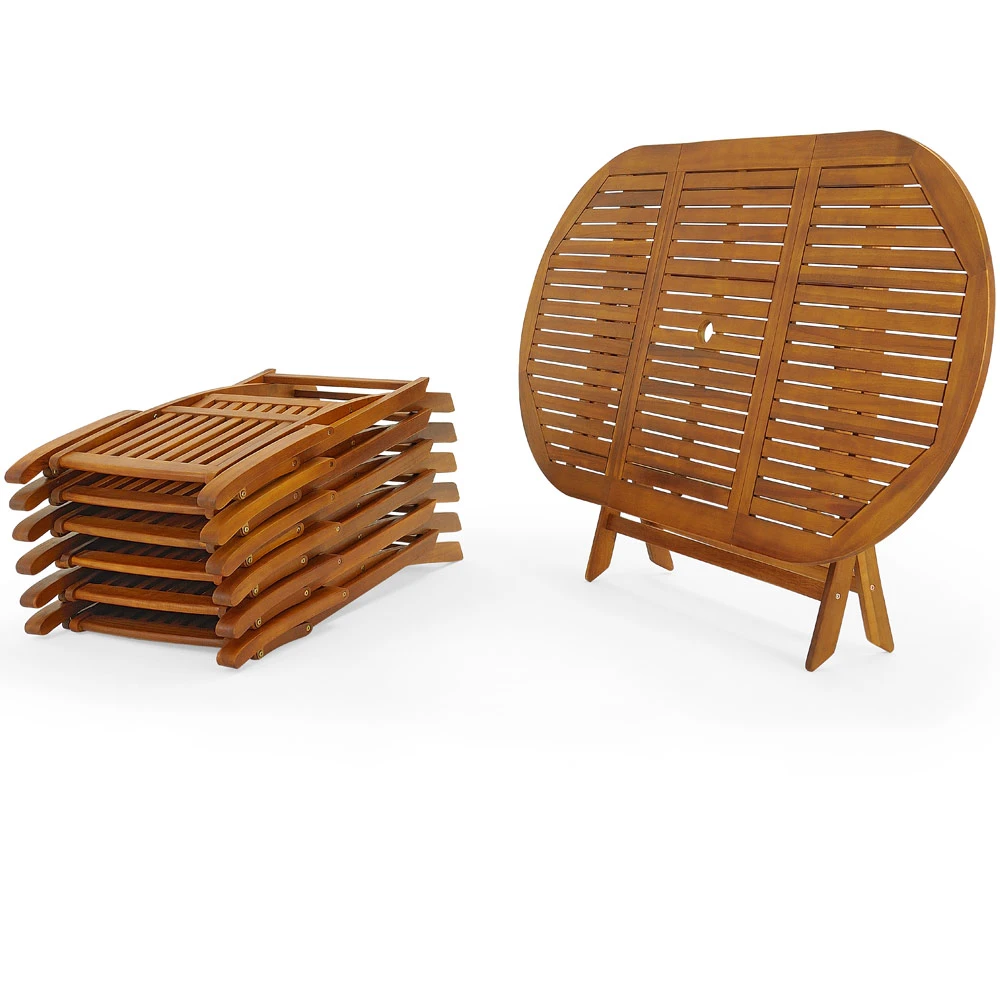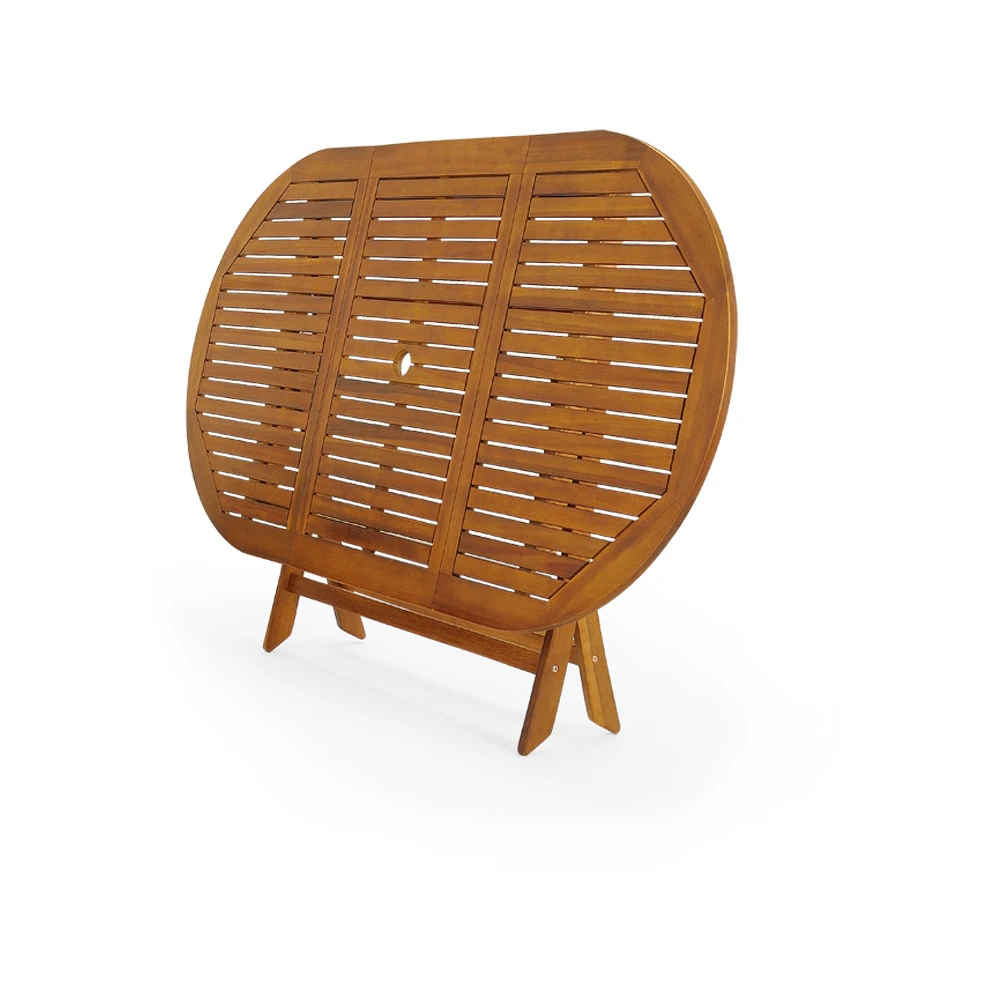 Die StĂŒhle und der Tisch der Gartengarnitur sind bei Nichtbenutzung platzsparend zusammenklappbar. Gelenke und Scharniere sind aus galvanisiertem Metall hergestellt und in der Mitte der Tischplatte befindet sich eine Halterung fĂŒr einen Sonnenschirm.