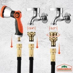 Der Sprühkopf besteht aus schlagfestem ABS und wurde mit einem edlen Chromlook versehen. Der unverwüstliche Flexschlauch hat nicht rostende Voll-Messing-Adapter, die sich von ½ auf ¾ Zoll erweitern lassen, damit Sie den Schlauch überall anschließen können. Im Lieferumfang sind zusätzlich zwei Gummidichtungen als Ersatzteil enthalten.