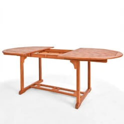 Der Tisch ist aus witterungsbeständigem Eukalyptusholz hergestellt.