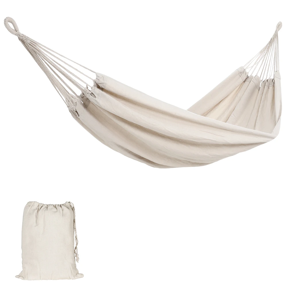 Die Hängematte besteht aus atmungsaktivem 320 g/m² Baumwoll-Polyester-Gemisch, der anschmiegsame Stoff ist hautfreundlich, wetterfest und wasserabweisend. Die Seile sind durch die gedrehten Zöpfe an den Enden sehr robust.