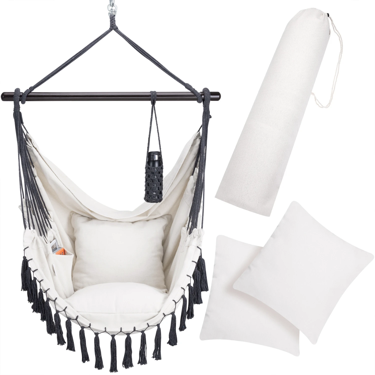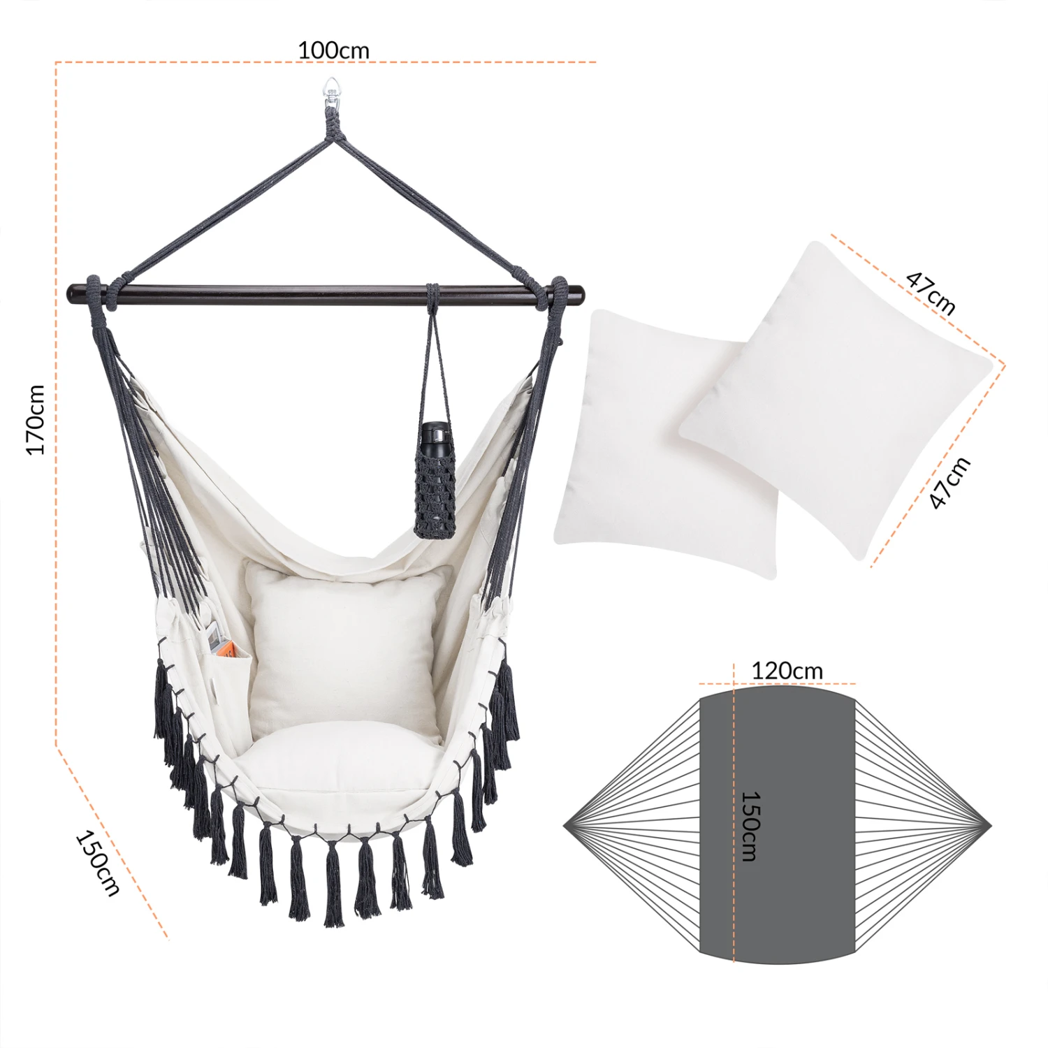 Der bequeme Hängesessel von Detex® bietet mit den 2 abnehmbaren Kissen einen sehr hohen Sitzkomfort. Dank der integrierten, großen Innentasche haben Sie Ihr Handy, Tablet oder Ihre Bücher schnell zur Hand. Der praktische Getränkehalter hält auch schwere 1-Literflaschen sicher am Platz. Der Flaschenhalter kann flexibel an der Haltestange befestigt werden und das Getränk ist so stets griffbereit.