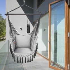 Der bequeme Hängesessel von Detex® bietet mit den 2 abnehmbaren Kissen einen sehr hohen Sitzkomfort. Dank der integrierten, großen Innentasche haben Sie Ihr Handy, Tablet oder Ihre Bücher schnell zur Hand. Der praktische Getränkehalter hält auch schwere 1-Literflaschen sicher am Platz. Der Flaschenhalter kann flexibel an der Haltestange befestigt werden und das Getränk ist so stets griffbereit.