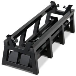 Die Füße sind höhenverstellbar und die Endstücke des Gestells sind mit Kunststoffkappen versehen. Der Sägebock hat außerdem einen Feststellbügel um das Holz beim Sägen zu sichern.