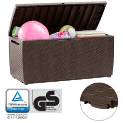 Diese Aufbewahrungsbox TÜV Rheinland GS geprüft ist der ideale Aufbewahrungsort für Sitzauflagen, Kissen und andere Gartenaccessoires.