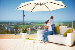 Dieser elegante Ampelschirm aus pulverbeschichtetem Aluminium ist über 300 cm groß, robust und mit der leichtgängigen Kurbel einfach zu bedienen. Er steht stabil auf einem Fußkreuz und kann überall platzsparend positioniert werden. Der leichtgängige Kurbelmechanismus sorgt für ein müheloses Öffnen und Verstellen des Schirms. Der Ampelschirm kann zudem ganz individuell geneigt bzw. gekippt werden.