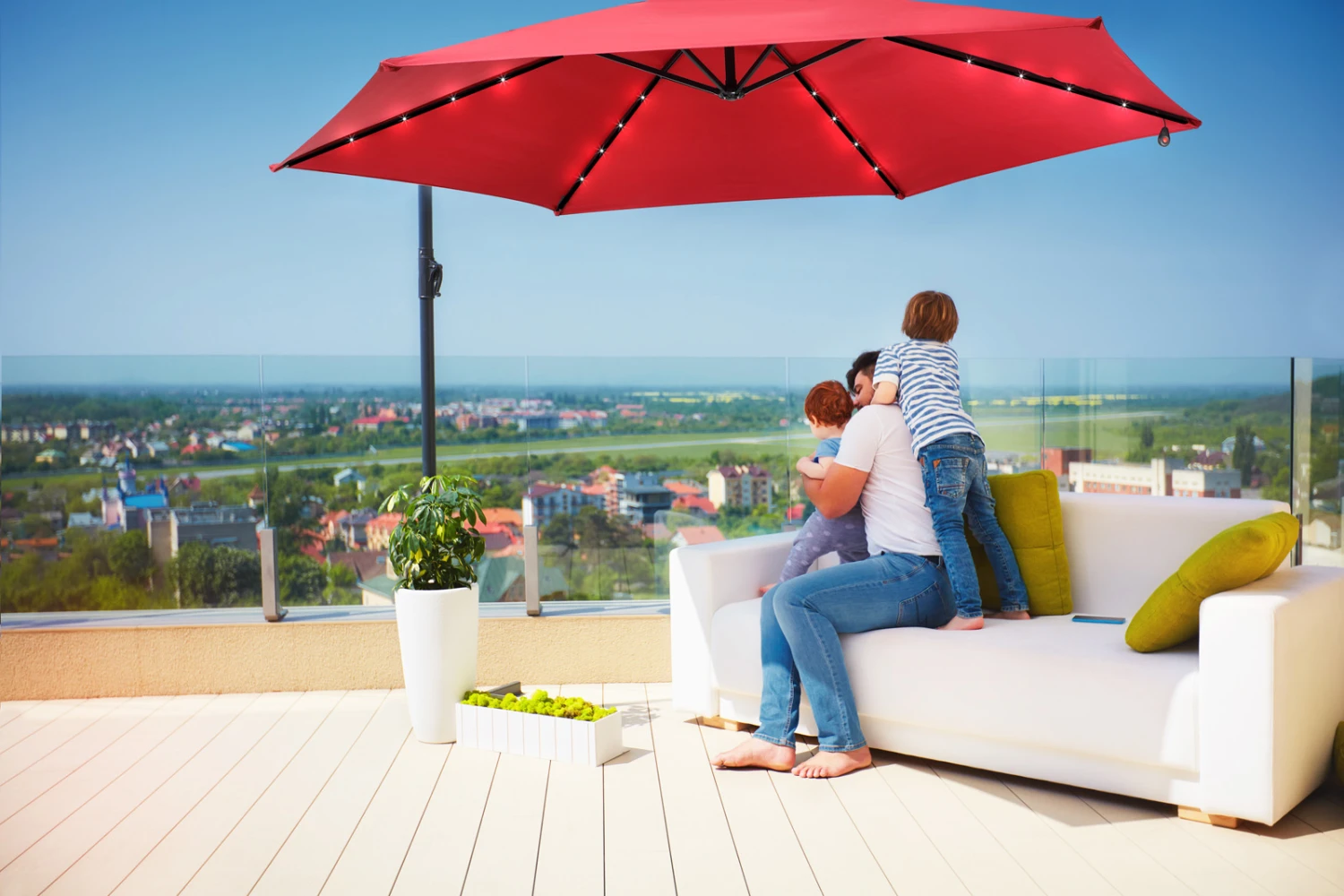 Die 24 LED Lampen sorgen mit ihrem stimmungsvollen Licht für ein angenehmes Ambiente. Strom liefert ein leistungsstarkes Solarpanel, das direkt oben am Schirm angebracht ist. Das Licht kann über einen kleinen und unauffälligen An-/Aus-Kippschalter gesteuert werden.