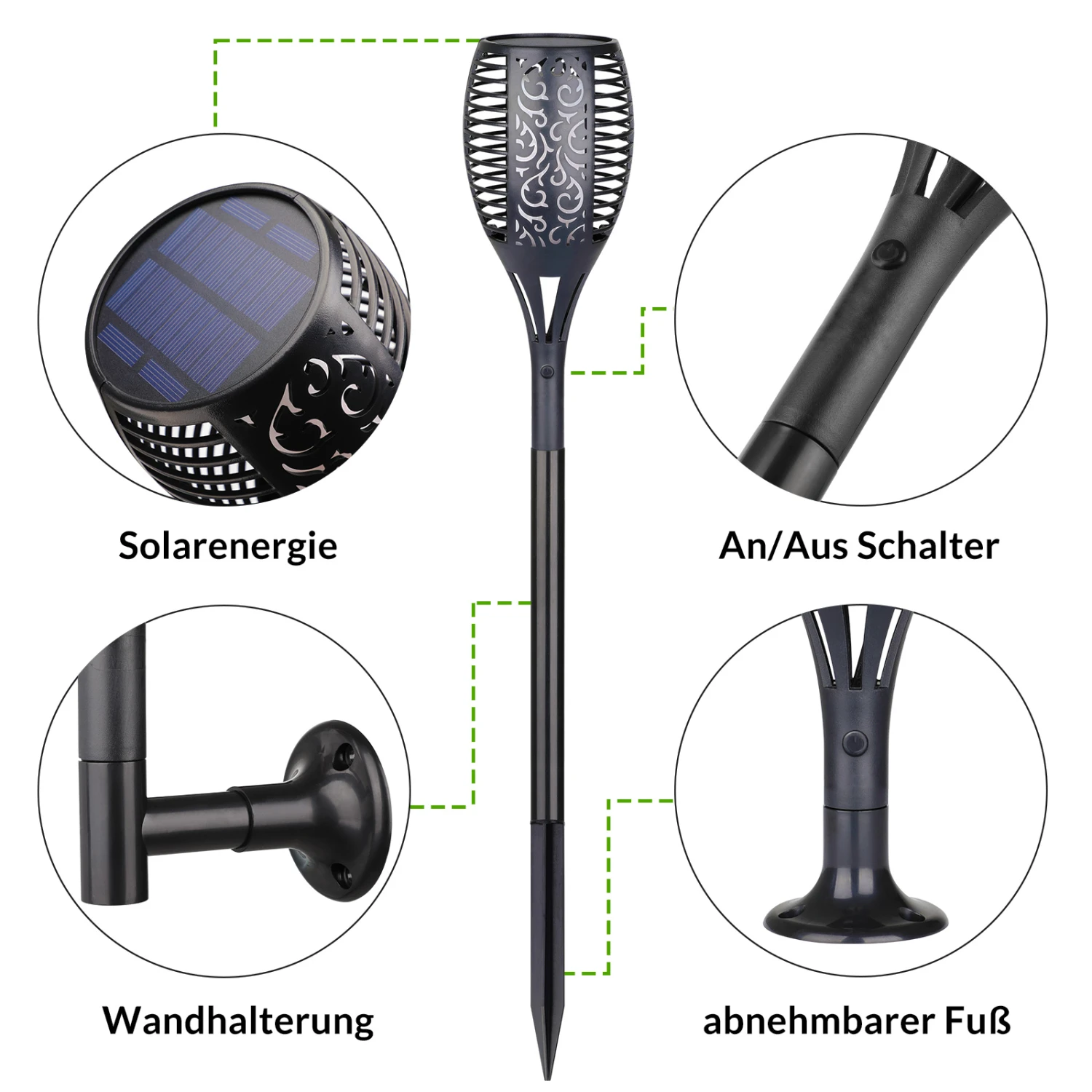 Die Outdoor-Solarleuchten bieten eine optimale Alternative zu echten Gartenfackeln. Sie leuchten und flackern wie richtige Fackeln und werden über Solarzellen und den integrierten Akku betrieben. Damit sind die Gartenleuchten unabhängig vom Stromnetz und können bei vollem Akku über 10 Stunden leuchten.