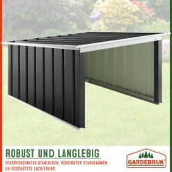 Die Trapez-Form der Metallplatten sorgt für eine optimale Wandstabilität. Zusätzliche Bodenleisten, Metallwinkel und 4 massive Erdnägel erhöhen die Stabilität und schützen die Garage vor Sturmwind. Durch die hochwertige Verzinkung ist der Unterstand äußerst resistent gegen Kälte und Rost.
