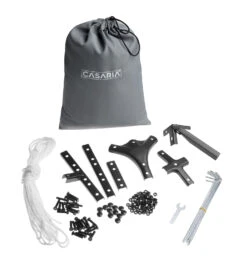 Die UV 50+ Dachbespannung besteht aus reißfestem Polyester und hat zusätzlich an der Innenseite eine wasserabweisende PU Beschichtung. Zudem kann das Dach mit Klettverschlüssen schnell und einfach am Gestänge befestigt werden, wodurch es stramm gespannt ist. Um die Bildung von Wassersäcken bei Regen zu vermeiden, sind Metallösen im Dach integriert. Diese können Sie nach Ihren Wünschen auch mit den mitgelieferten Kunststoffstopfen schließen.