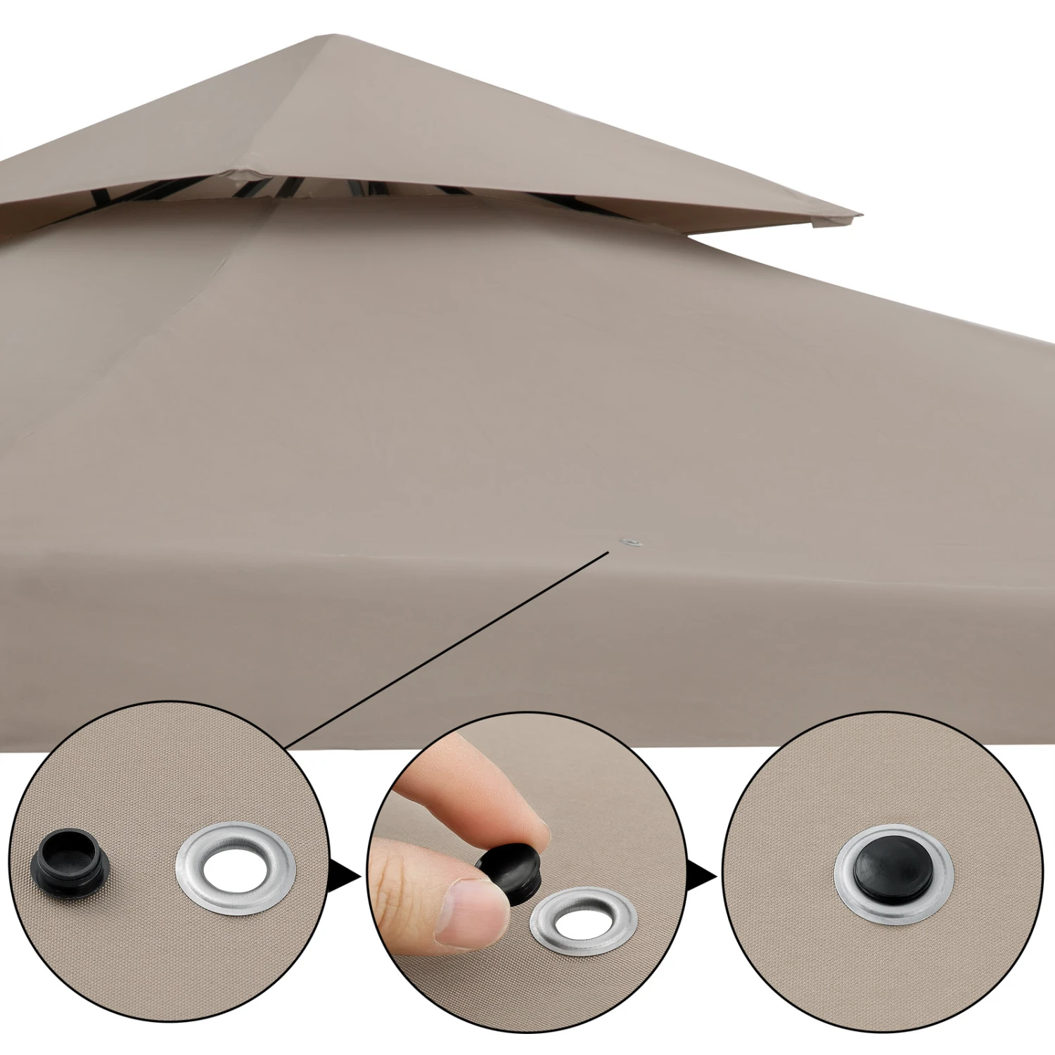 Die UV 50+ Dachbespannung besteht aus reißfestem Polyester und hat zusätzlich an der Innenseite eine wasserabweisende PU Beschichtung. Zudem kann das Dach mit Klettverschlüssen schnell und einfach am Gestänge befestigt werden, wodurch es stramm gespannt ist. Um die Bildung von Wassersäcken bei Regen zu vermeiden, sind Metallösen im Dach integriert. Diese können Sie nach Ihren Wünschen auch mit den mitgelieferten Kunststoffstopfen schließen.