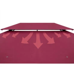 Die UV 50+ Dachbespannung besteht aus reißfestem Polyester und hat zusätzlich an der Innenseite eine wasserabweisende PU Beschichtung. Zudem kann das Dach mit Klettverschlüssen schnell und einfach am Gestänge befestigt werden, wodurch es stramm gespannt ist. Um die Bildung von Wassersäcken bei Regen zu vermeiden, sind Metallösen im Dach integriert. Diese können Sie nach Ihren Wünschen auch mit den mitgelieferten Kunststoffstopfen schließen.
