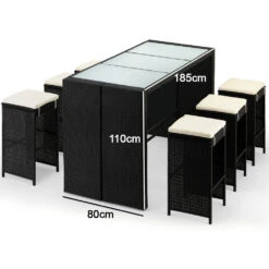Das Barset besteht aus einem groĂen Gartentisch – Bartisch mit Glasplatten plus 6 Barhockern mit Sitzauflagen und FuĂrasten aus Aluminium. Das Set lĂ€sst sich durch die Leichtbauweise multifunktional einsetzen.