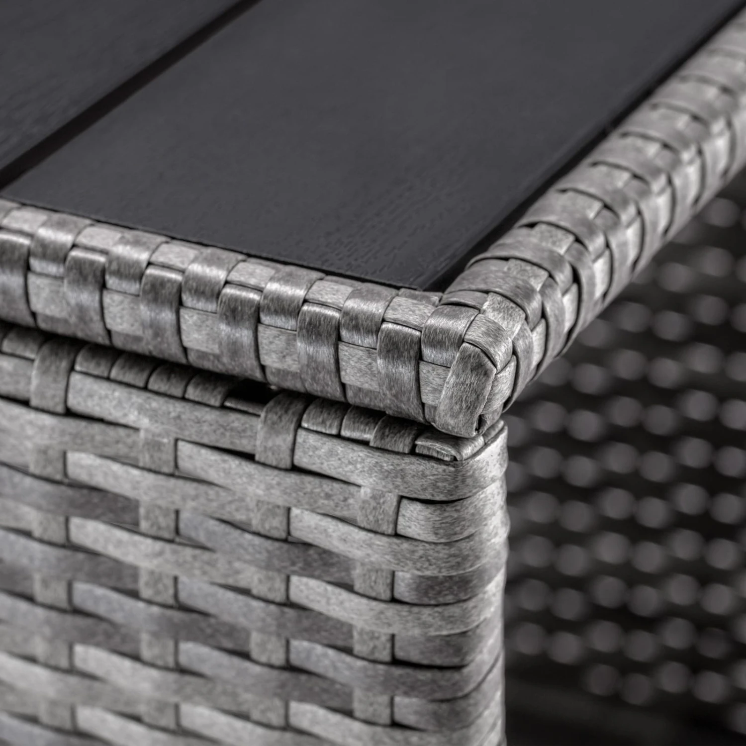 Das Polyrattan des Teetisches ist wetterfest, schmutzabweisend und UV-lichtbeständig. Das Gestell des Tisches wurde aus pulverbeschichtetem Stahl gefertigt und ist dadurch besonders langlebig, stabil und robust. Die Tischplatte kann mit insgesamt 80 kg belastet werden.