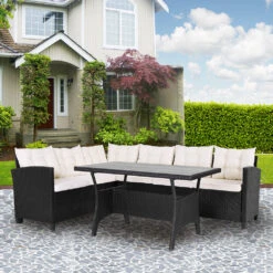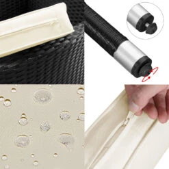 Das Polyrattan ist UV-lichtbeständig, schmutzabweisend und einfach zu reinigen. Durch ein pulverbeschichtetes Stahlgestell hält das Set starken Beanspruchungen stand. Die robuste Tischplatte in Holzoptik ist aus sehr robustem, langlebigen WPC gefertigt.