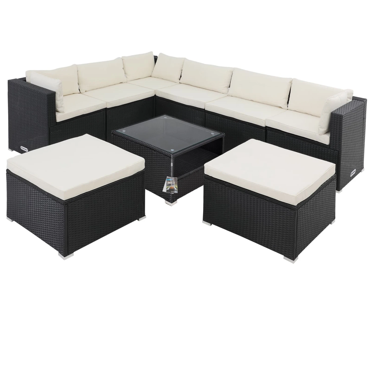Diese Sitzgarnitur aus Polyrattan besticht durch die Vielzahl an Kombinationsmöglichkeiten. Jedes einzelne Element steht frei und lässt sich individuell nach Ihren Wünschen aufstellen. Die komfortablen Sitzflächen bieten eine Sitzhöhe von 50 cm. Die Einzelelemente lassen sich individuell miteinander kombinieren. Besonders elegant ist die extrabreite Rückenlehne, die für einen hohen Sitzkomfort sorgt.