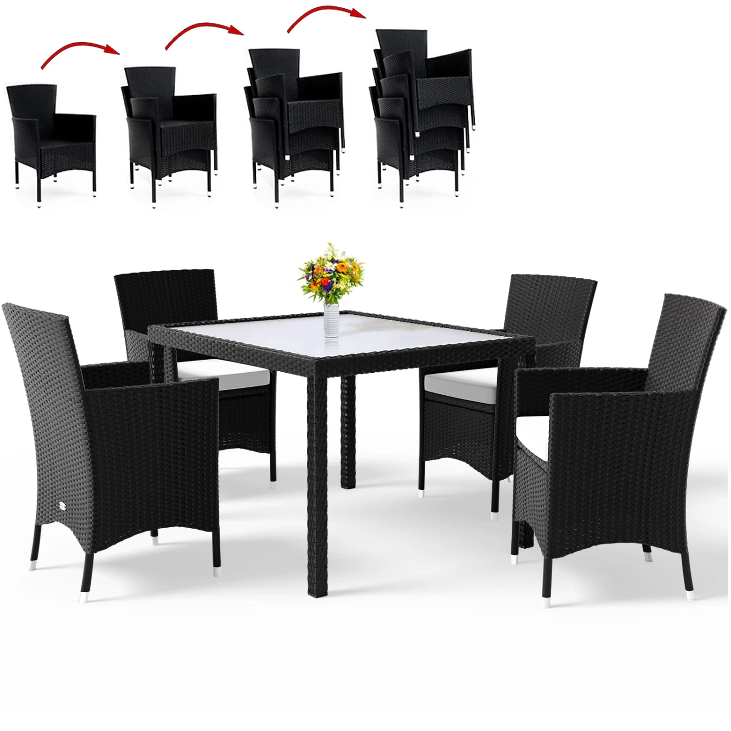 Das Polyrattanset besteht aus 1 Tisch, 4 StĂŒhlen mit 4 abnehmbaren Kissen (gekettelt).