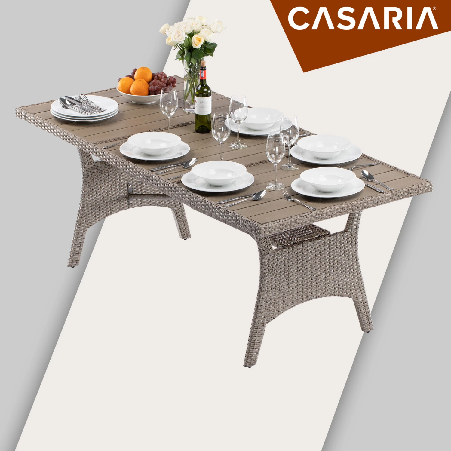 Dieser exklusive Polyrattan Gartentisch ist mit einer sehr robusten und widerstandsfähigen Tischplatte aus WPC in Holzoptik ausgestattet. Dadurch ist der Tisch vor Wind und Wetter gut geschützt und ideal für den Garten, die Terrasse oder im Haus geeignet.