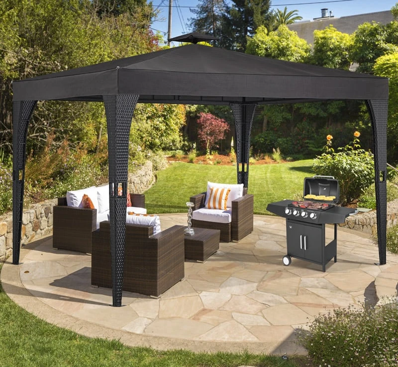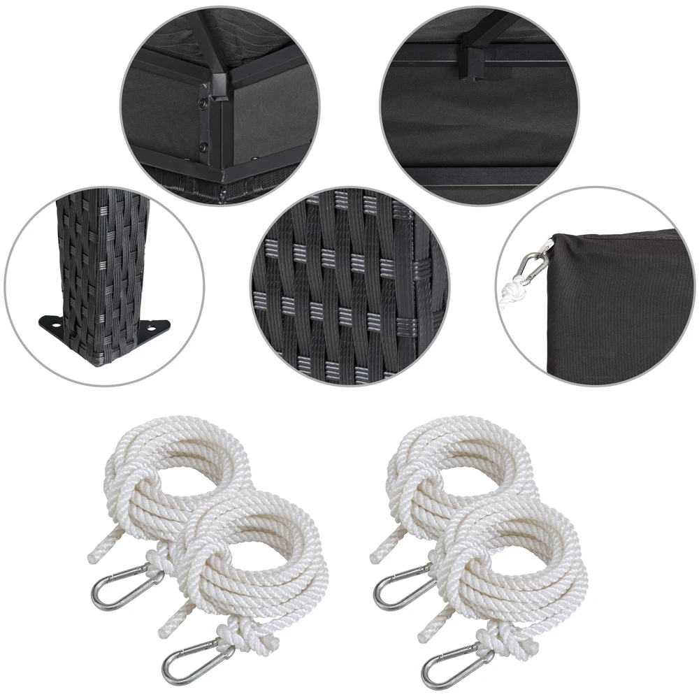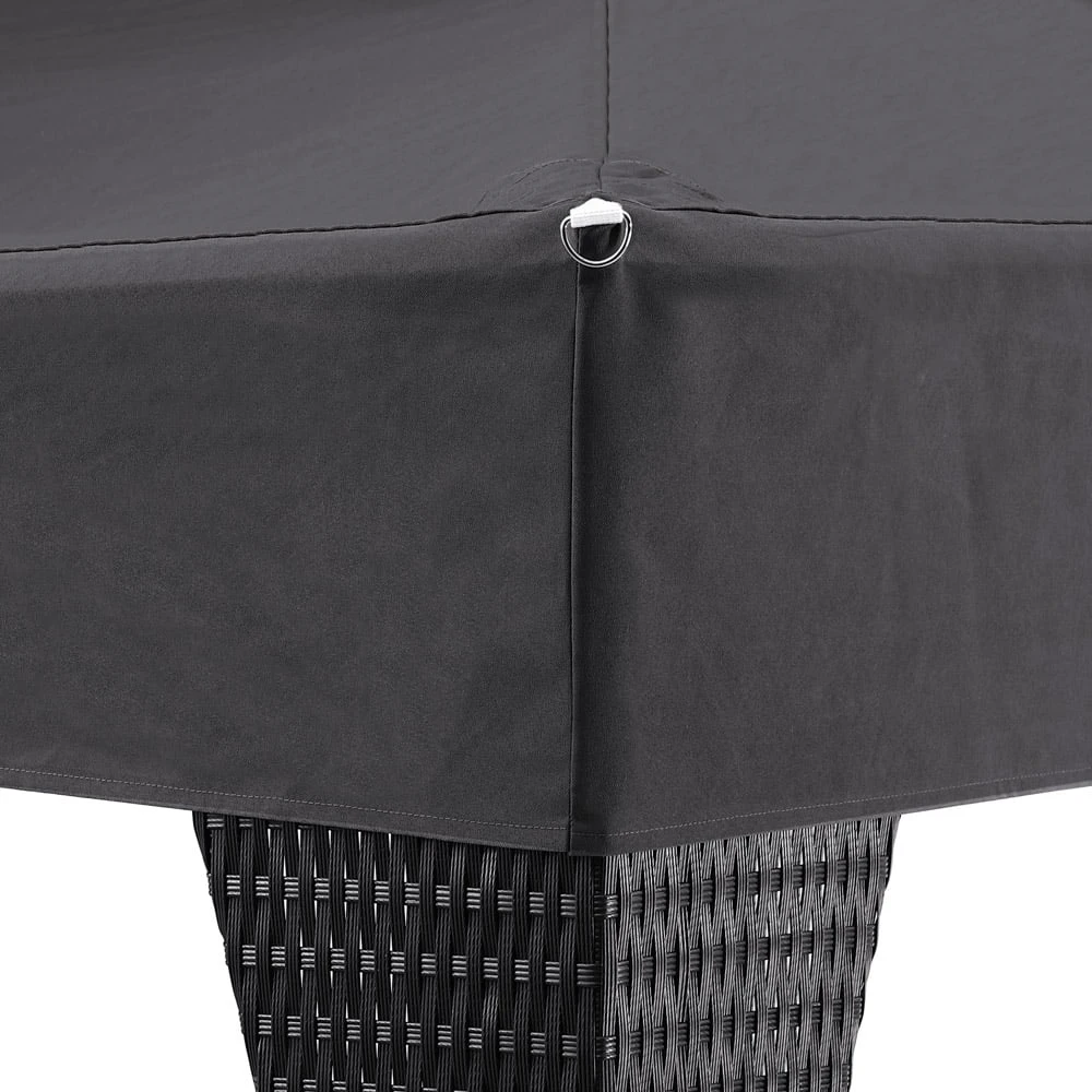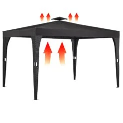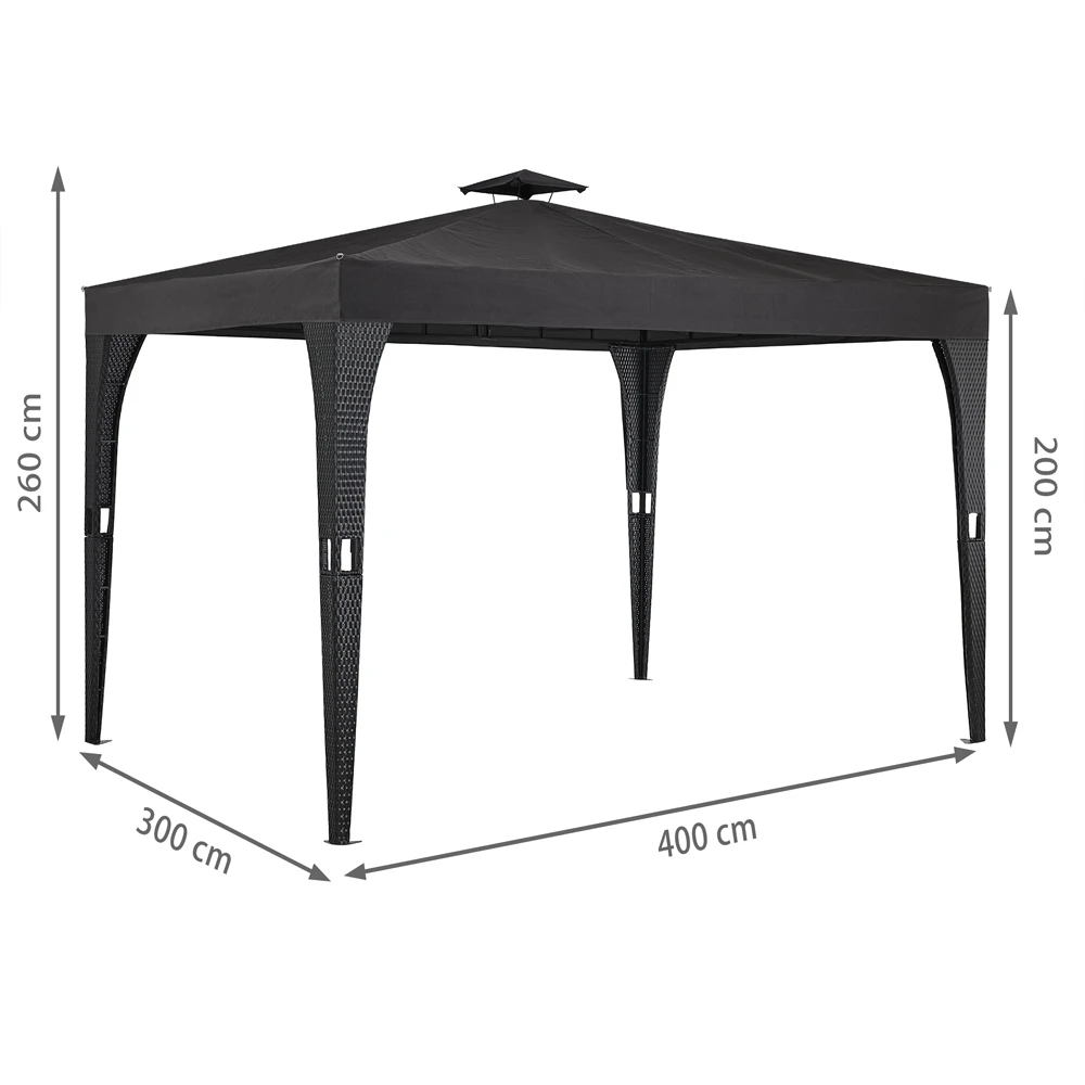Der schicke 3 x 4 m Polyrattan Pavillon spendet Schatten und sorgt fĂŒr ein schönes Ambiente nicht nur bei Festen, Partys und sonstigen Veranstaltungen. Die Dachhaube sorgt an heiĂen Tagen fĂŒr ausreichende BelĂŒftung und Luftzirkulation. Die in das Dach eingearbeiteten Ăsen lassen Regenwasser kontrolliert ablaufen.