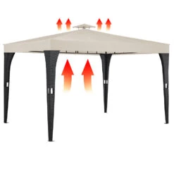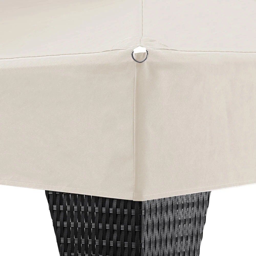 Der schicke 3 x 4 m Polyrattan Pavillon spendet Schatten und sorgt für ein schönes Ambiente nicht nur bei Festen, Partys und sonstigen Veranstaltungen. Die Dachhaube sorgt an heißen Tagen für ausreichende Belüftung und Luftzirkulation. Die in das Dach eingearbeiteten Ösen lassen Regenwasser kontrolliert ablaufen.