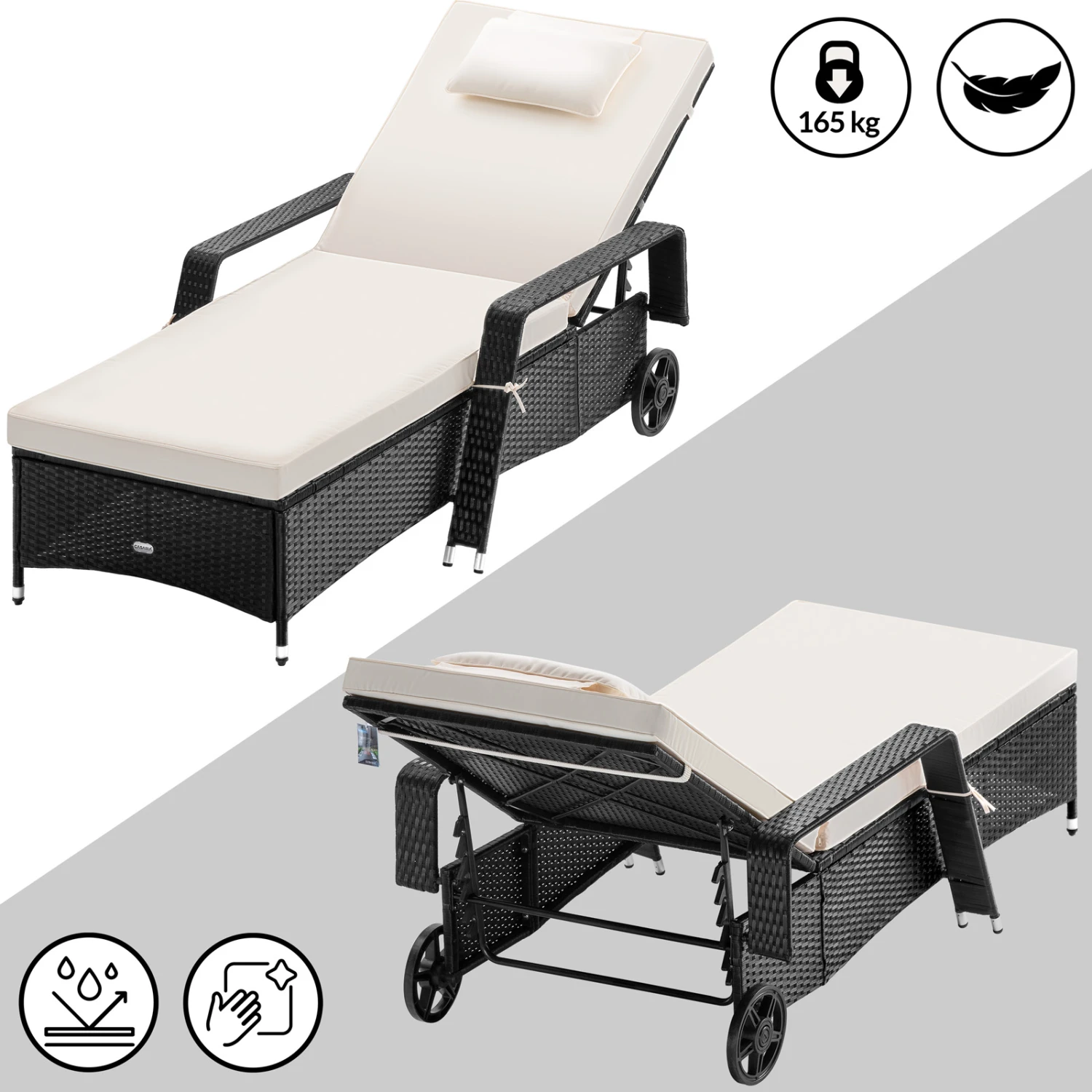 Die Polster sind wasserabweisend und UV-lichtbeständig. Die Liege ist mit bis zu 160 kg belastbar.