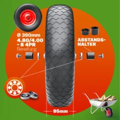 Dank der mitgelieferten Achse ist der Schubkarrenreifen einfach und schnell auf die Schubkarre zu montieren und einsatzbereit, dabei ist er geeignet für alle handelsüblichen Schubkarren.
