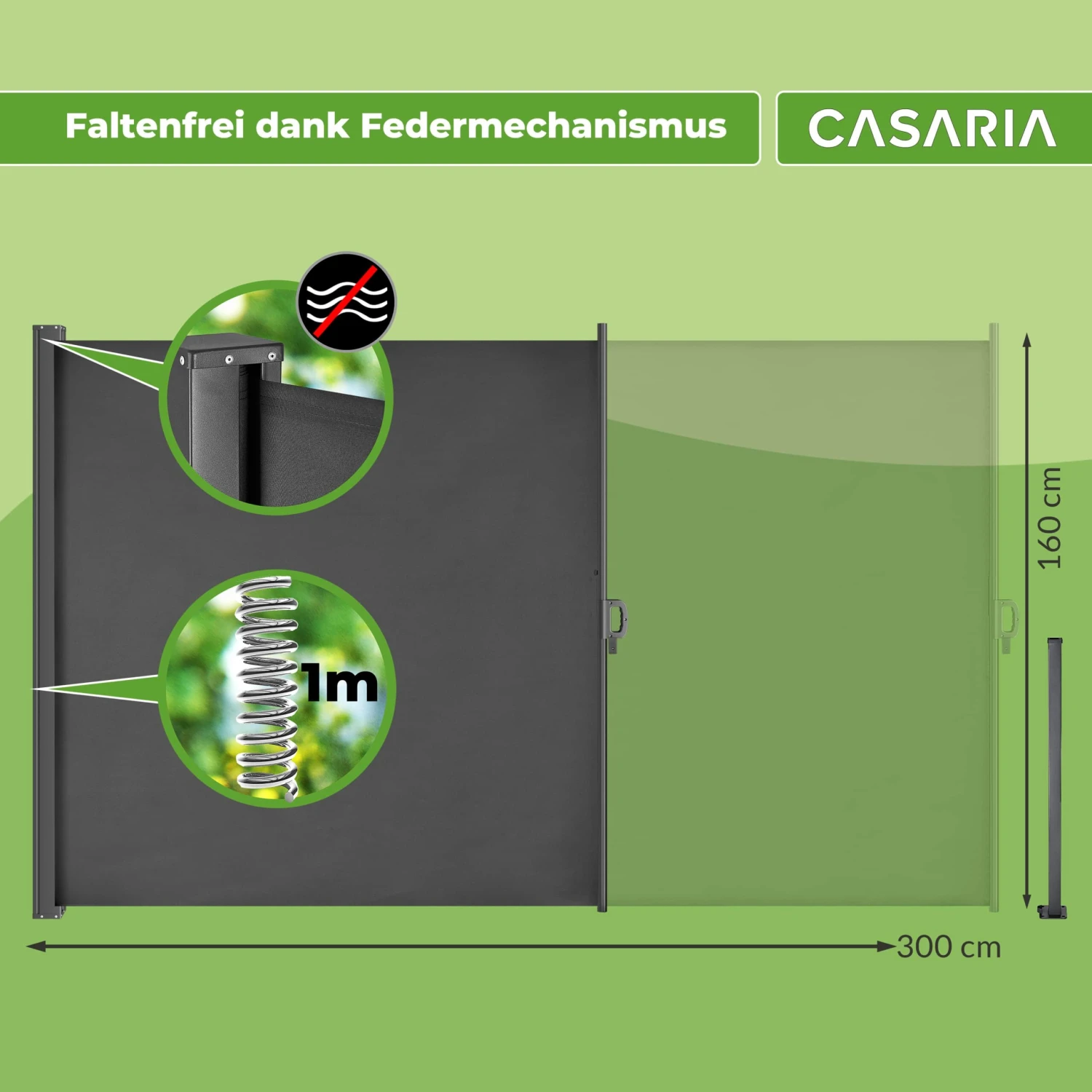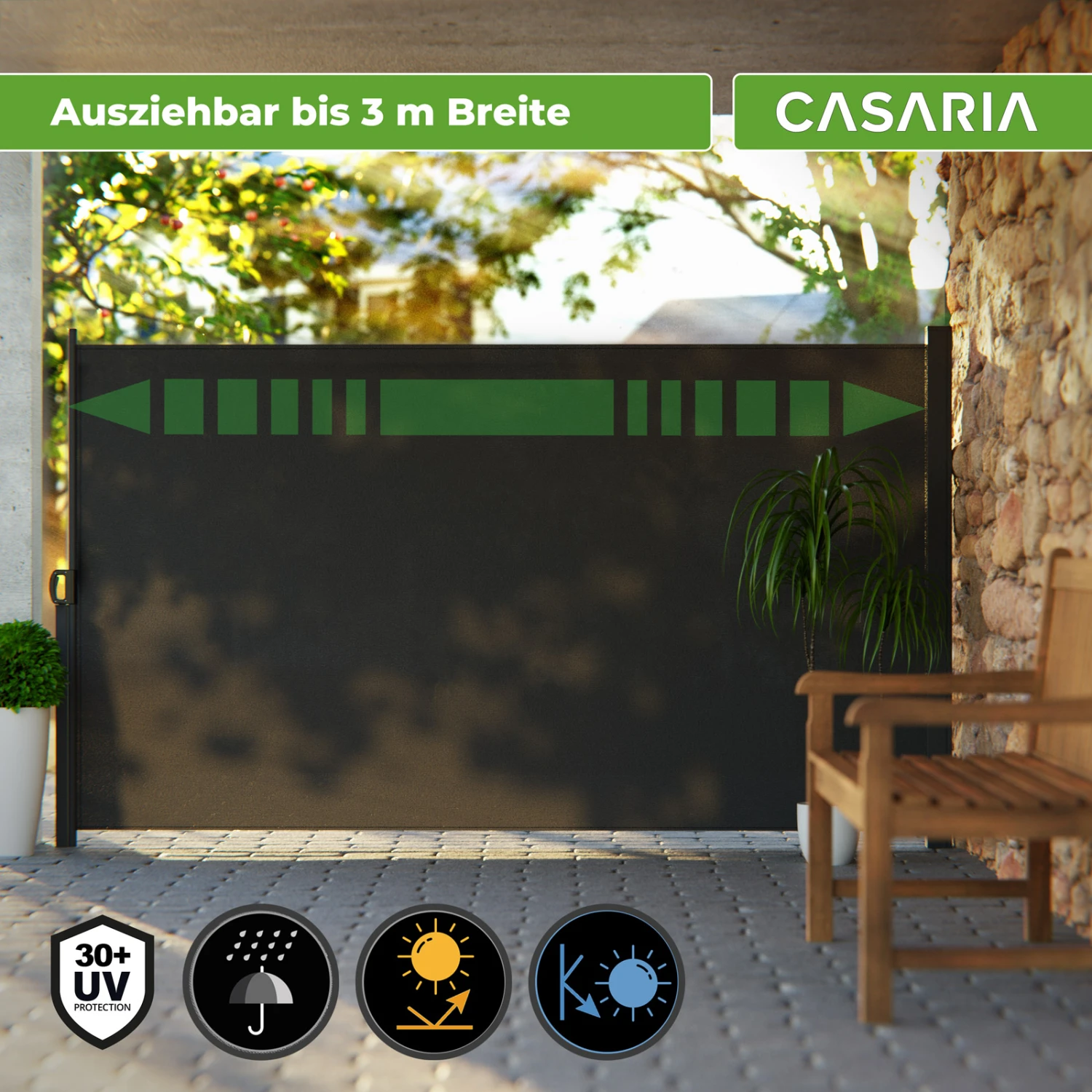 Die hochwertige Seitenmarkise Nosara von CasariaÂź schĂŒtzt optimal vor neugierigen Blicken. Die robuste Markisenkassette besteht aus pulverbeschichtetem Stahl und beinhaltet einen blickdichten Markisenstoff aus widerstandsfĂ€higem Polyester (180 g/mÂČ). Durch die PU-Beschichtung ist der Stoff wasserabweisend, wetterbestĂ€ndig und leicht zu reinigen. Windböen oder Sonneneinstrahlung werden ebenso zuverlĂ€ssig abgehalten.
