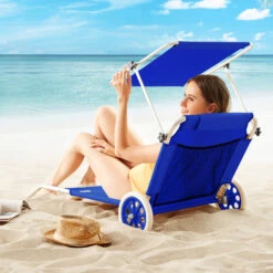 Die klappbare Sonnenliege lässt sich durch die 2 stabilen Räder leicht bewegen und ist platzsparend zu verstauen.