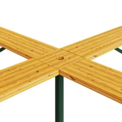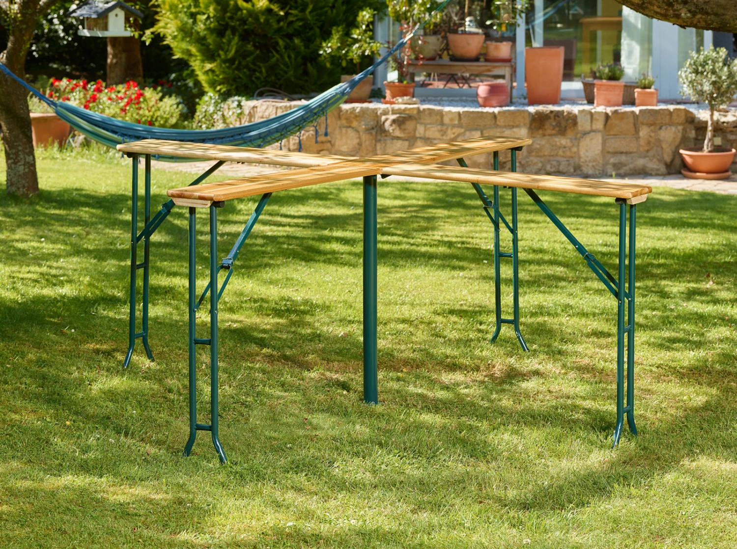 Einzigartiger Bierzelttisch mit 4 Auslegern, die bis zu 20 Personen Platz bieten. Wunderbar als Ergänzung zu normalen Bierzeltgarnituren. In der Mitte des Holztisches befindet sich eine Lochung, in die ein Sonnenschirm eingelassen werden kann.