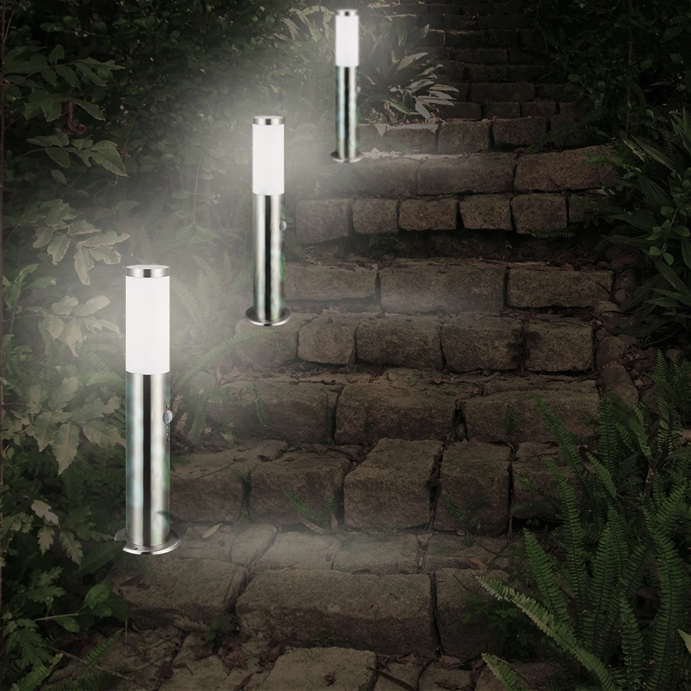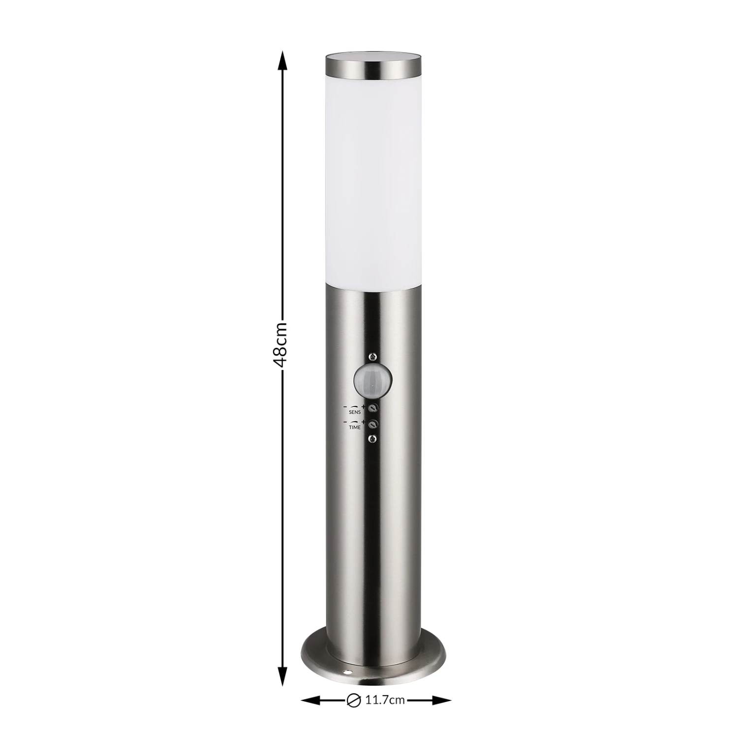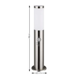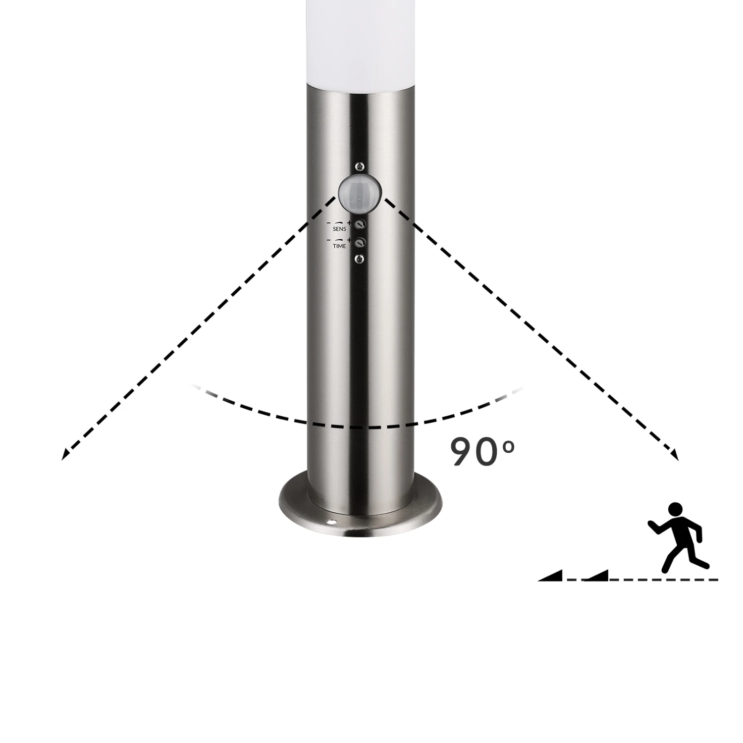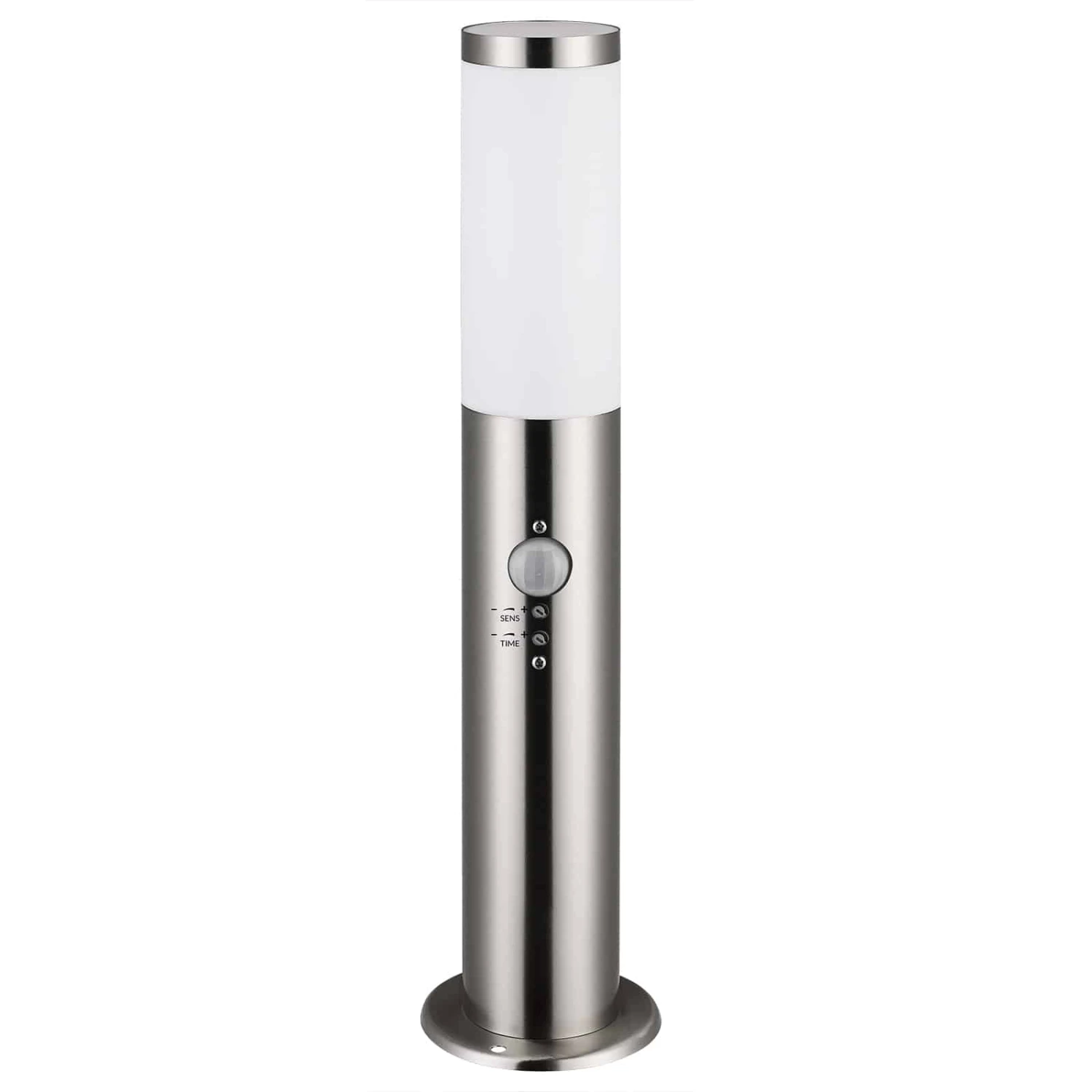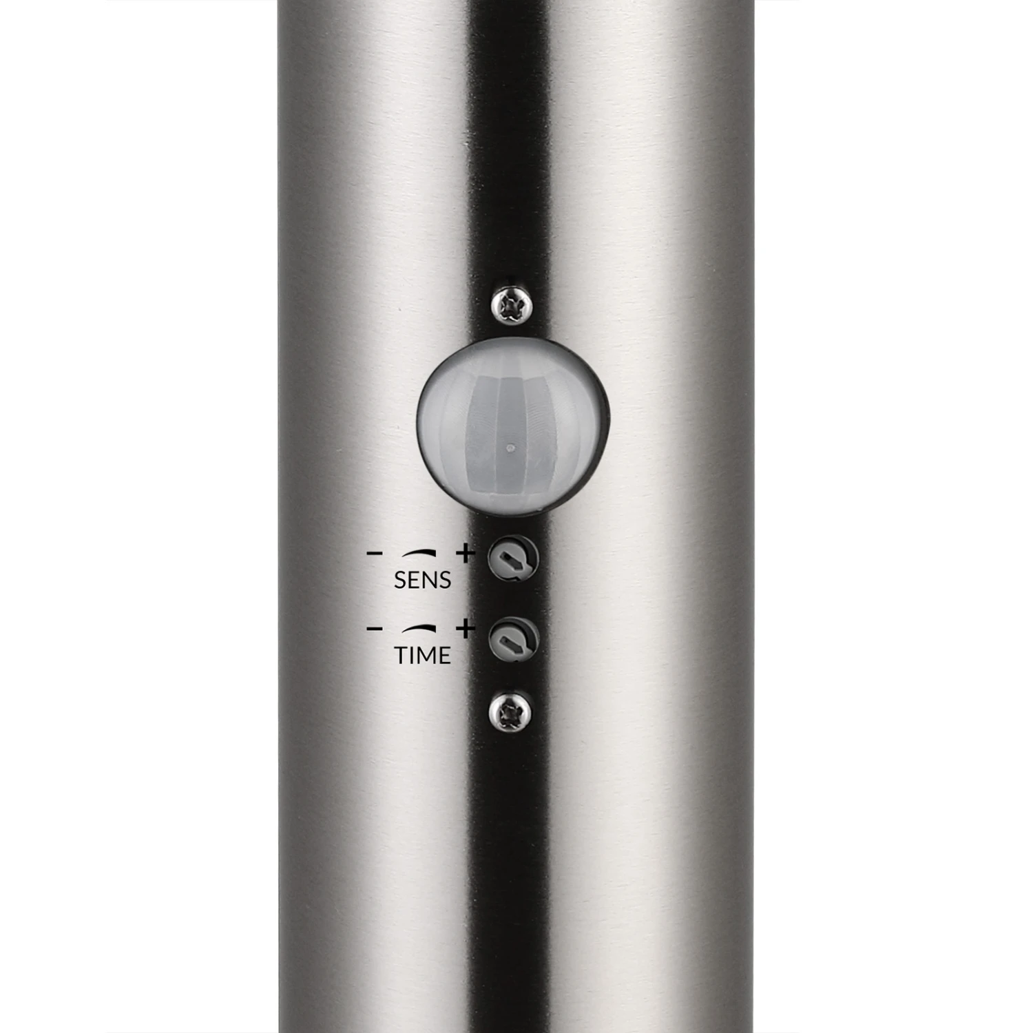 Die Außenleuchte aus Edelstahl ist mit einem Bewegungssensor ausgestattet, der in der Helligkeitsempfindlichkeit und Leuchtdauer stufenlos einstellbar ist.