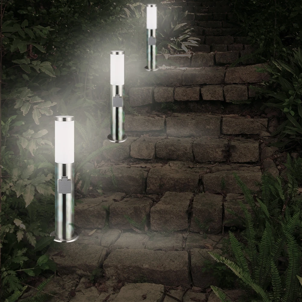 Die Außenleuchten aus Edelstahl haben eine zusätzliche Steckdose, sind spritzwassergeschützt (IP44) und wetterbeständig und so perfekt für den In-/und Outdoorbetrieb geeignet.